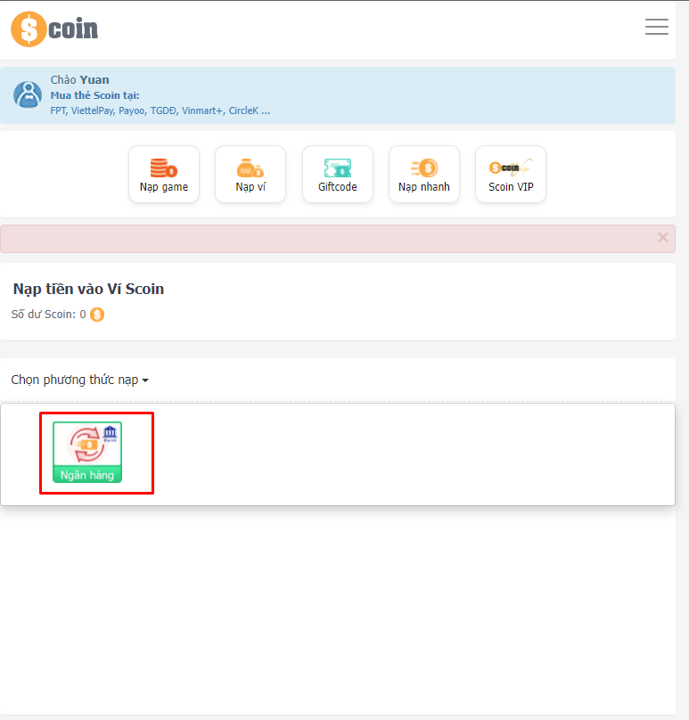 Bước 1: Đại hiệp vào trang <https://scoin.vn/nap-vao-game?GameId=330525>[\&SaleId=126](https://scoin.vn/nap-vao-game?GameId=330499\&SaleId=126) , đăng nhập vào tài khoản, chọn "Nạp game" (Ưu Tiên), Đại hiệp cũng có thể chọn "Nạp ví" để tích lũy khi cần có thể thao tác nạp nhanh không cần chờ đợi