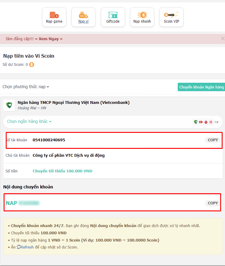 Lưu ý: Chuyển tối thiểu 100.000VNĐ