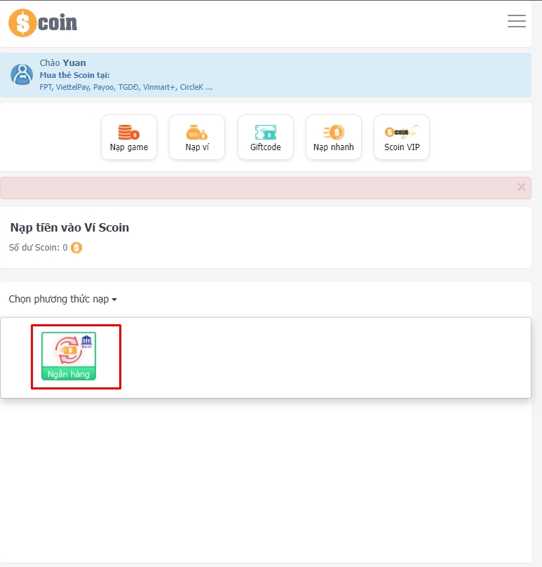 Bước 1: Đại hiệp vào trang https://scoin.vn/nap-vao-game?GameId=330525&SaleId=126 , đăng nhập vào tài khoản, chọn "Nạp game" (Ưu Tiên), Đại hiệp cũng có thể chọn "Nạp ví" để tích lũy khi cần có thể thao tác nạp nhanh không cần chờ đợi