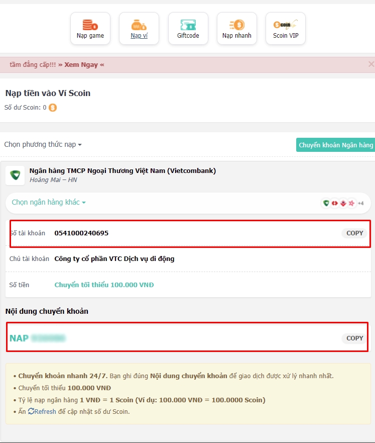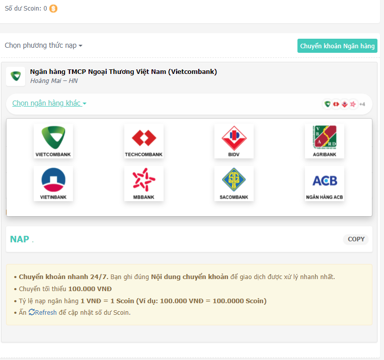 Nạp qua Banktranfer